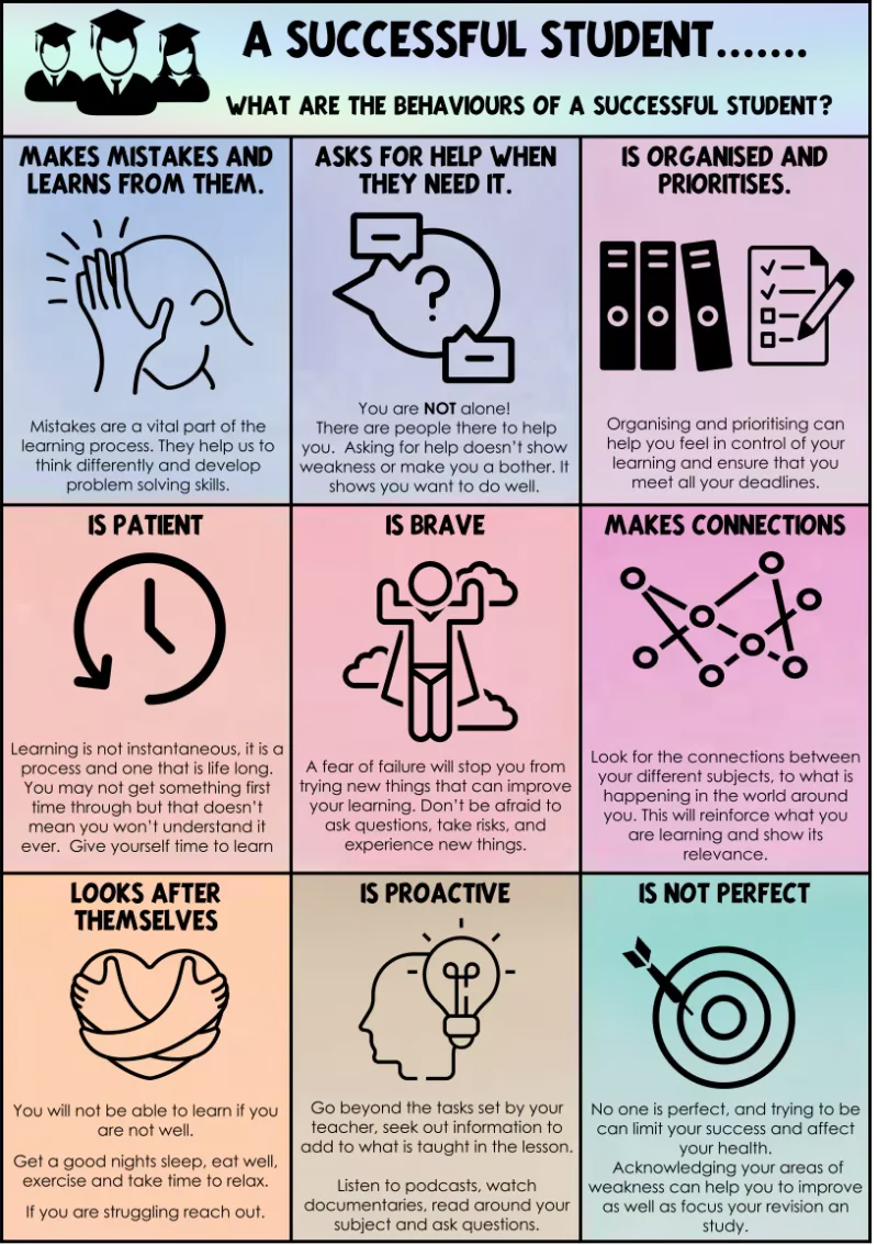 I am always trying to get my students to consider how their behaviour and habits can impact their success as a student, and this found I had a gap on my classroom wall for a display, so I decided to try and put the advice I give into a poster format. This advice isn’t anything new and although it might link to research, I haven’t read anything specific that links to it. When I first posted this to Twitter it received a lot of positive attention, which is why I have decided to do a blog post to share it as well.