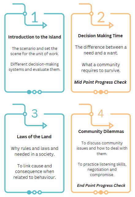 In this unit the students will be pretending that they have been shipwrecked on a desert Island with no chance of rescue and so have to create a community. This includes discussing rules and laws, resources and necessities, and dealing with community problems. It is a group work based unit so helps to develop inter-personal skills.