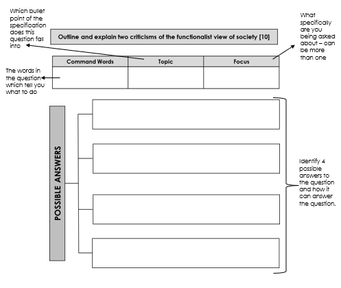 - APPLY – Use examples, Sociologists and studies to illustrate your point or explanation, where appropriate