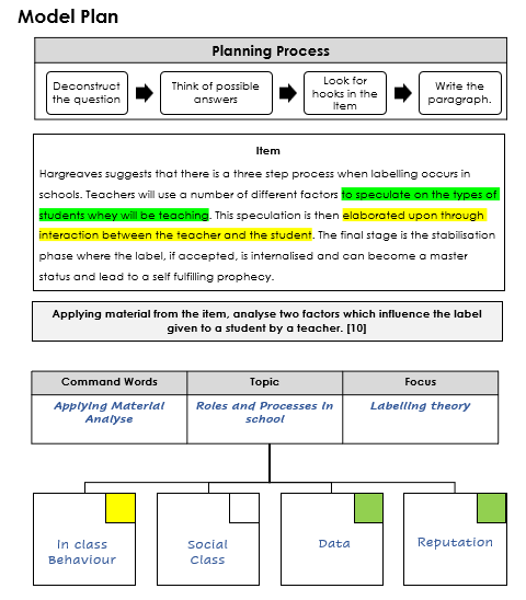 - APPLY – You must link both paragraphs to elements in the item. This must be explicit and clear that you are taking information from the item, by using the term “the item”, you do not have to quote, you can paraphrase but it must be explicit and must flow with the rest of your paragraph. This should sit in your paragraph where it best fits. You can also use examples, Sociologists and studies to illustrate your point or explanation, where appropriate.