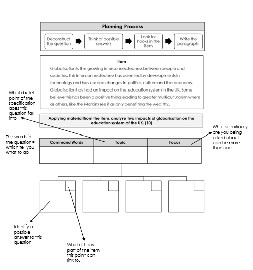 When planning for this question, you need to remember that the item is not there to give you the answers, this is not a comprehension question. It is there to provide evidence and support to your answer. Therefore the planning process for this style question is as follows: